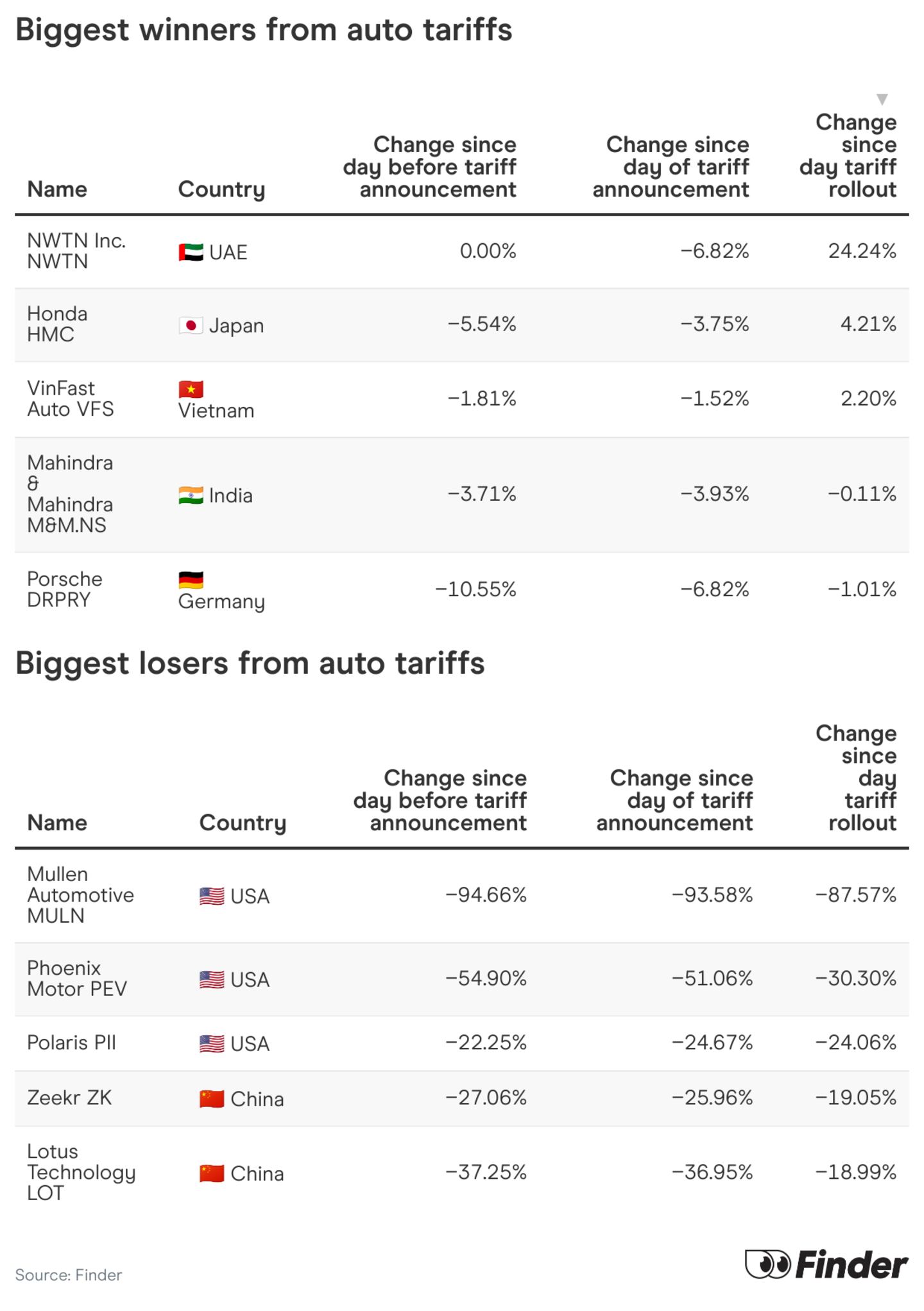 Unsurprisingly, it sent shockwaves through the automotive industry and financial markets—consumers rushed to buy cars ahead of potential price hikes, and investors scrambled to assess the fallout. According to Finder data, there was plenty of fallout.