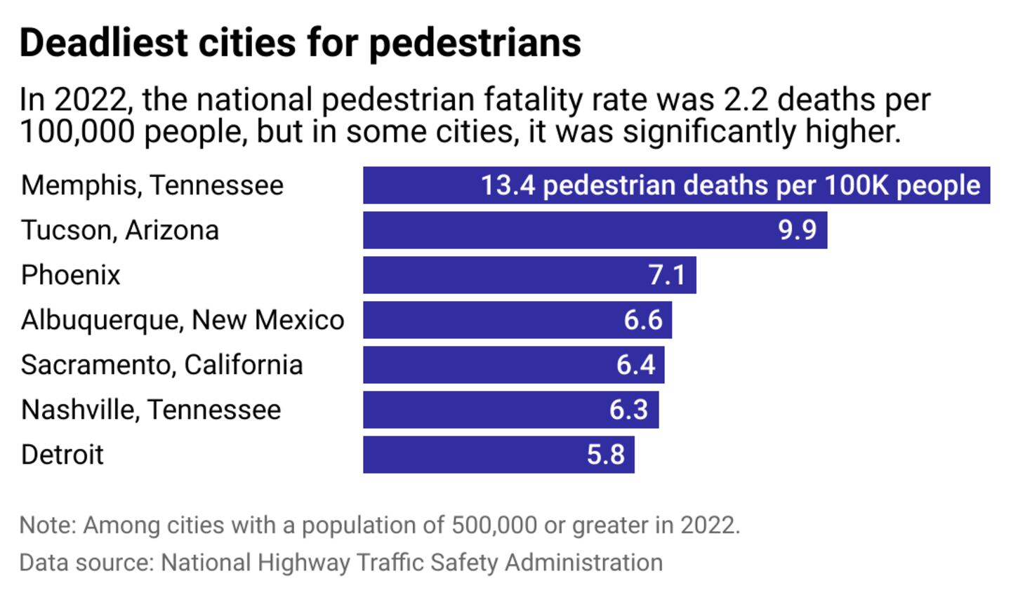 The six deadliest places for pedestrians in 2022 were fast-growing, auto-dependent metro areas in the Sun Belt, where the population is increasing faster than other parts of the country, and where streets center around the automobile.