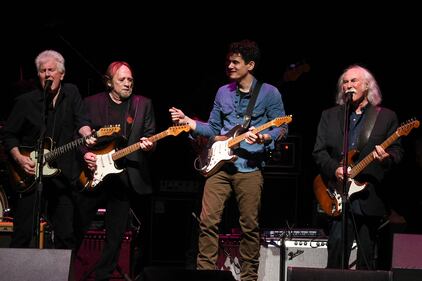 2nd Light Up The Blues Concert - An Evening Of Music To Benefit Autism Speaks - Inside LOS ANGELES, CA - APRIL 05: (L-R) Musicians Graham Nash, Stephen Stills, John Mayer, and David Crosby perform onstage at the 2nd Light Up The Blues Concert - An Evening Of Music To Benefit Autism Speaks at The Theatre At Ace Hotel on April 5, 2014 in Los Angeles, California. (Photo by Imeh Akpanudosen/Getty Images for LUTB) (Imeh Akpanudosen)