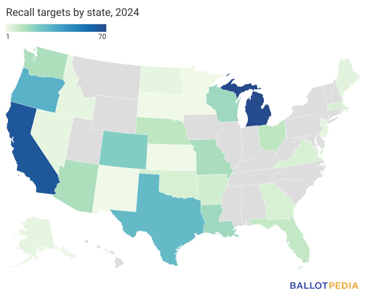 Michigan had the most officials targeted for recall in 2024 with 70, followed by California with 65. Michigan also led the nation in recall targets in 2018, 2022, and 2023. California had the most officials targeted for recall in the other five years from 2016 to 2021.