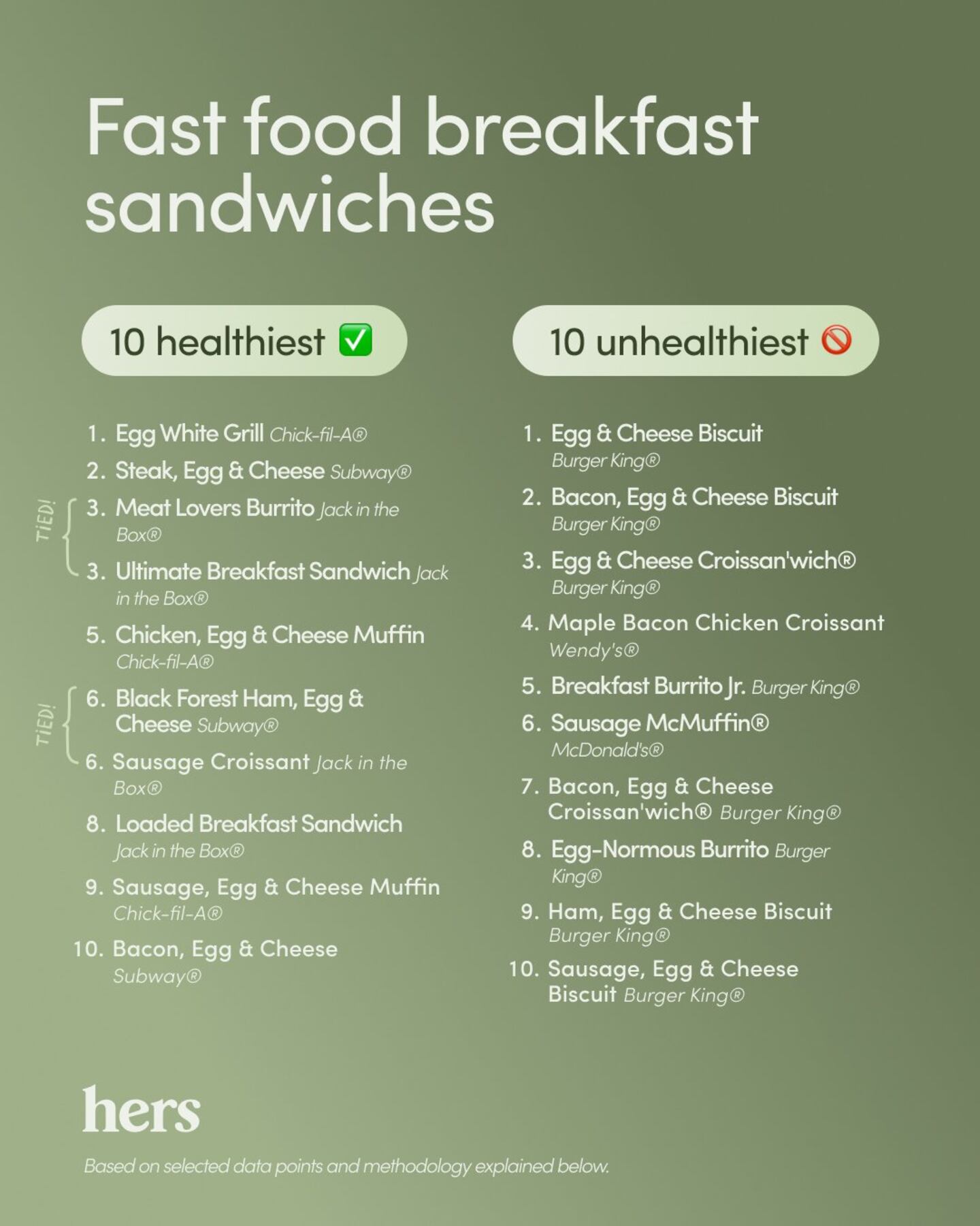 Going to a fast food restaurant in the morning doesn’t have to derail your health goals. Understanding what factors impact breakfast sandwich nutrition can go a long way in helping you feel your best throughout the day. That’s why Hers analyzed over 91 breakfast sandwich, wrap, and burrito options from the biggest fast food chains in the U.S. to discover what makes a menu item healthier than the available alternatives.