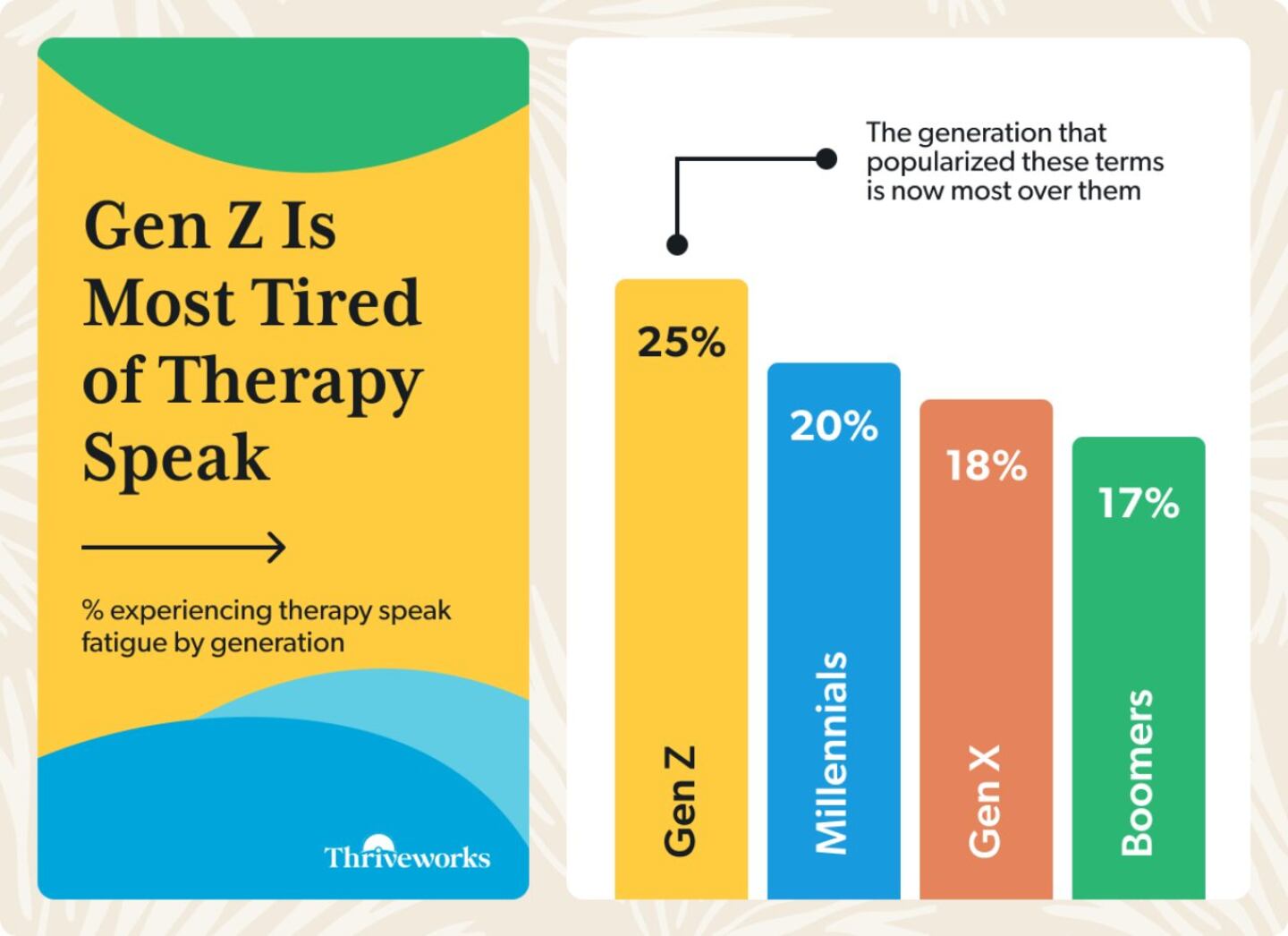 The most telling finding? The generation often credited with bringing therapy language mainstream—Gen Z—is now the most tired of it. While 25% of Gen Z report fatigue with therapy speak, that drops to just 17% among Boomers. It suggests that people might be witnessing the maturation of a movement, where the early adopters are leading a more thoughtful conversation about precision and responsibility in mental health language.
