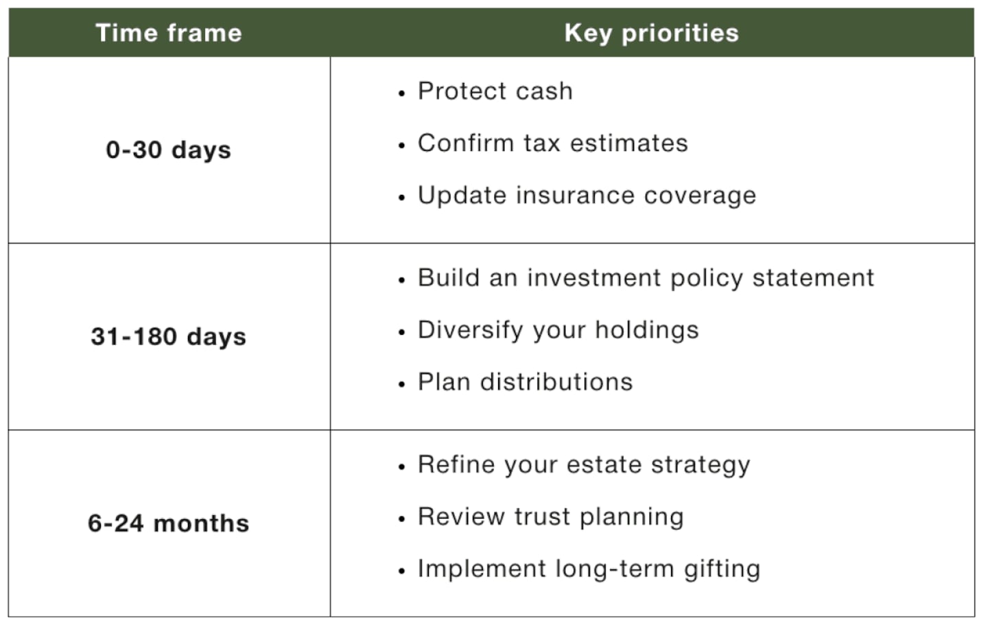 Wealth preservation begins with stabilizing liquidity, diversifying concentrated positions, considering charitable structures, and coordinating tax-efficient investment strategies. A written plan that integrates spending, investing, and risk management is key.