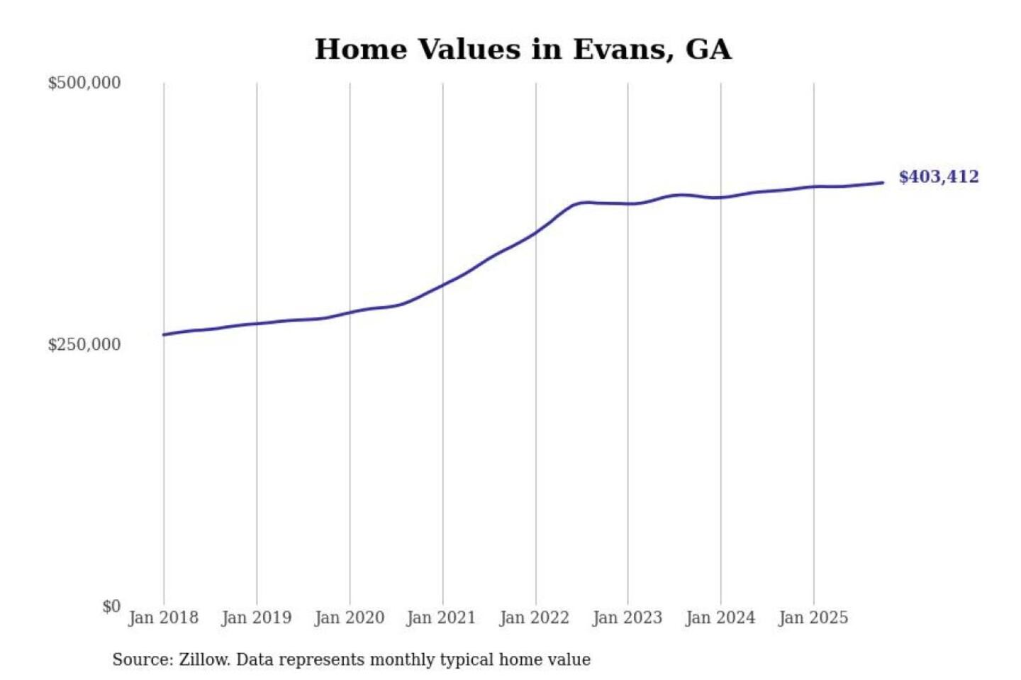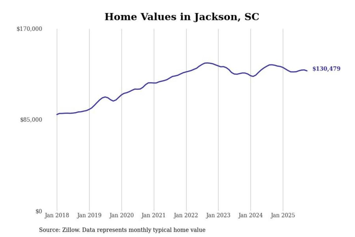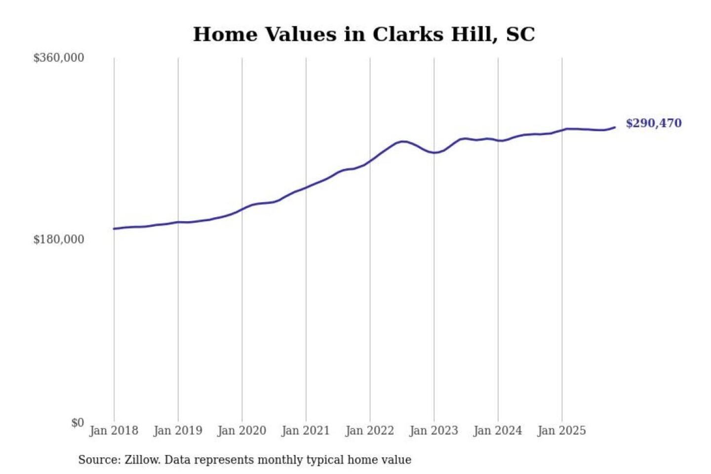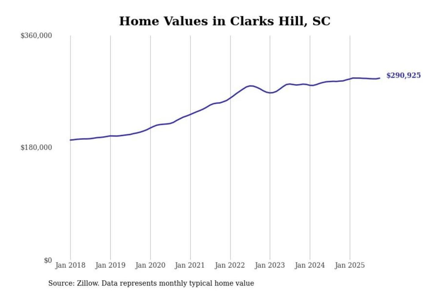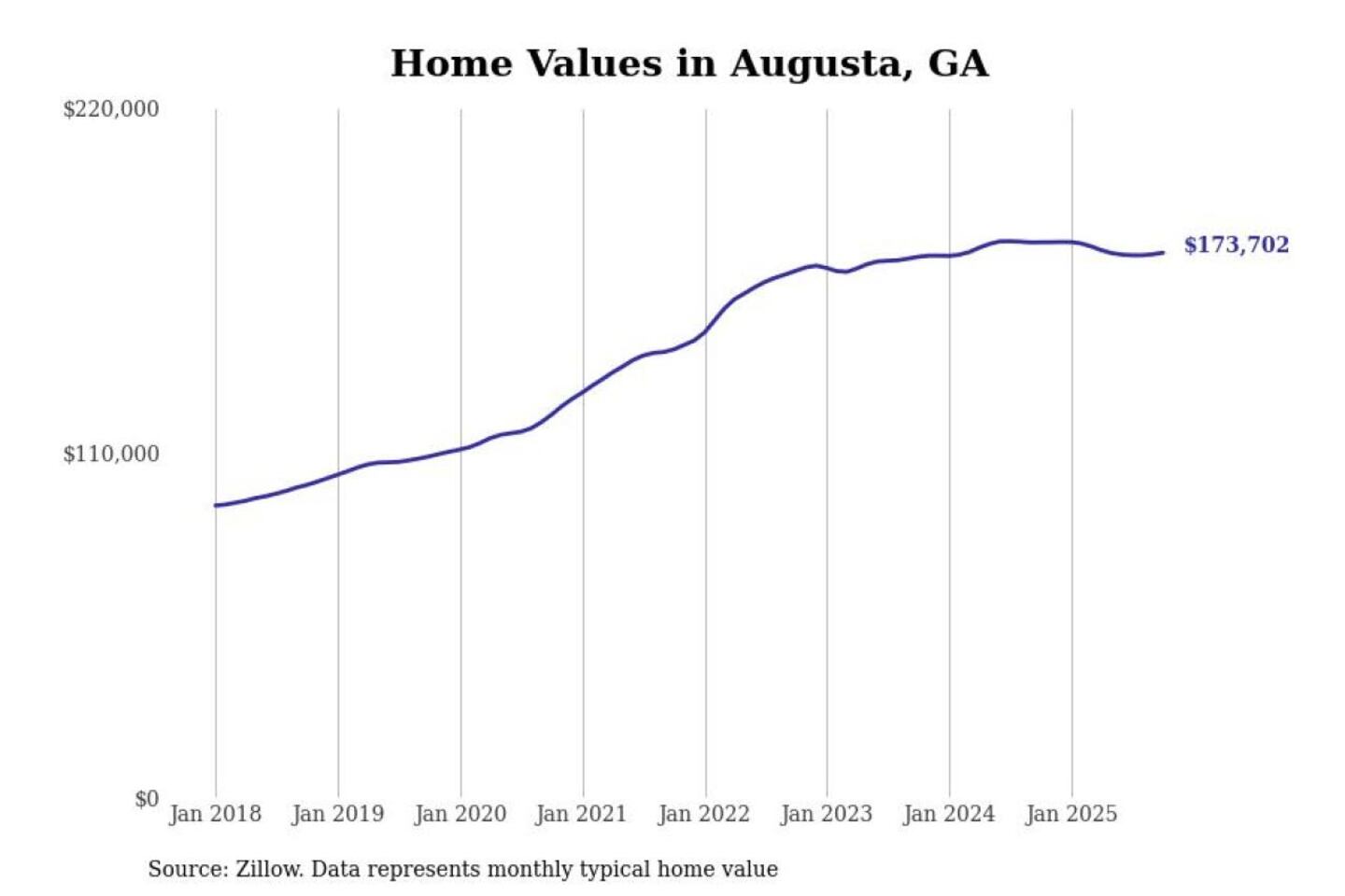 Stacker compiled a list of cities with the most expensive homes in the Augusta-Richmond County, GA-SC metro area using data from Zillow. Charts show the monthly typical home value since January 2018.