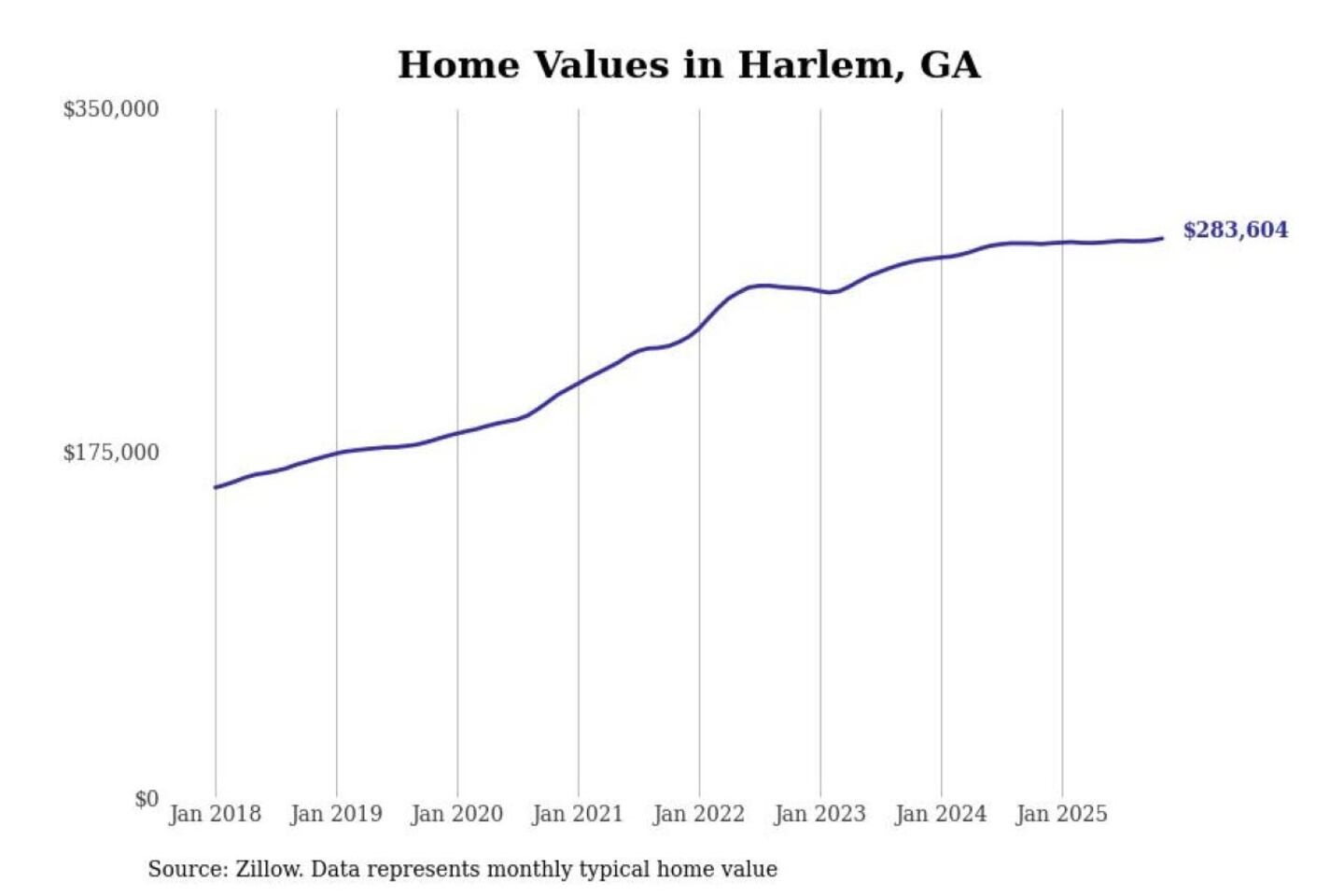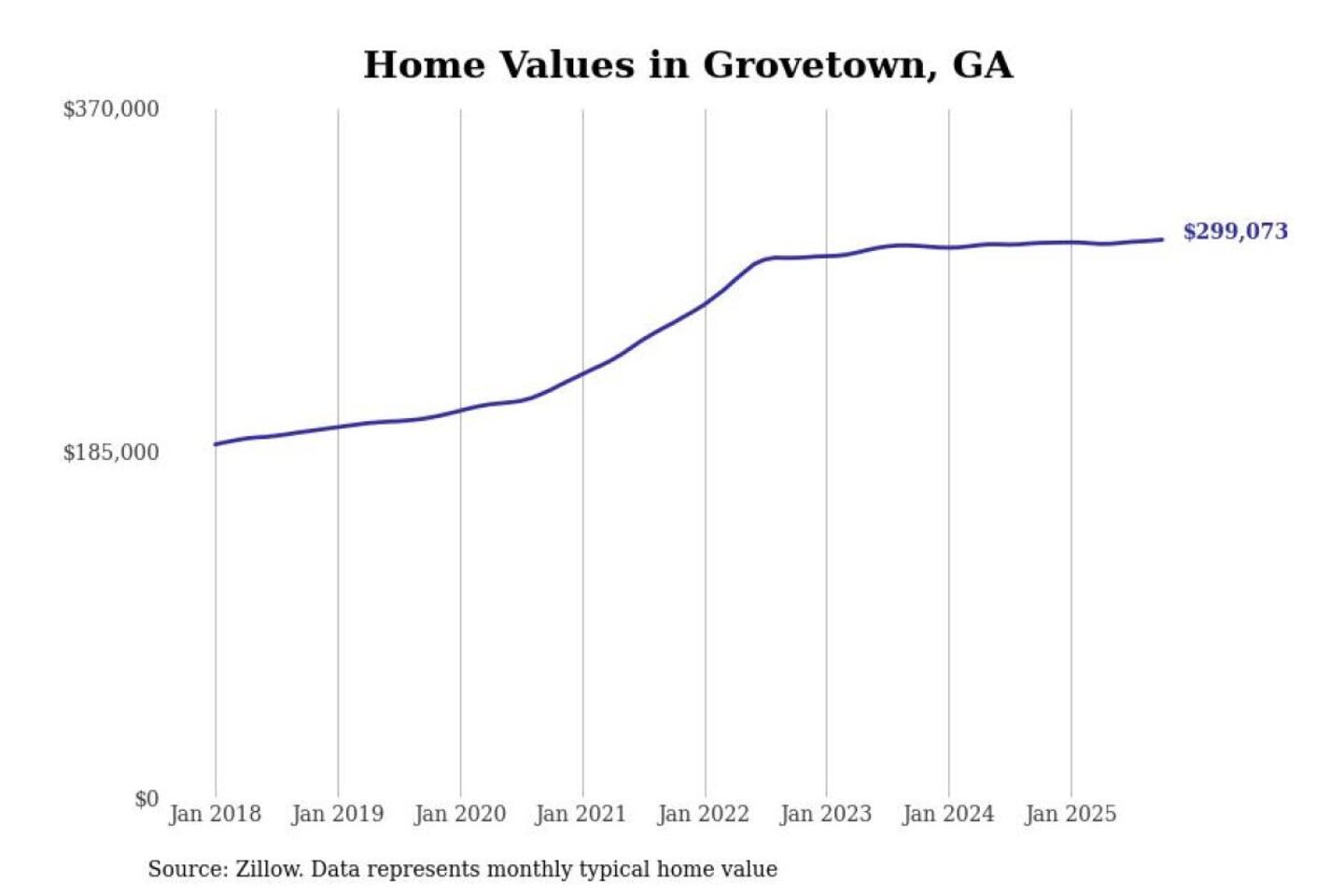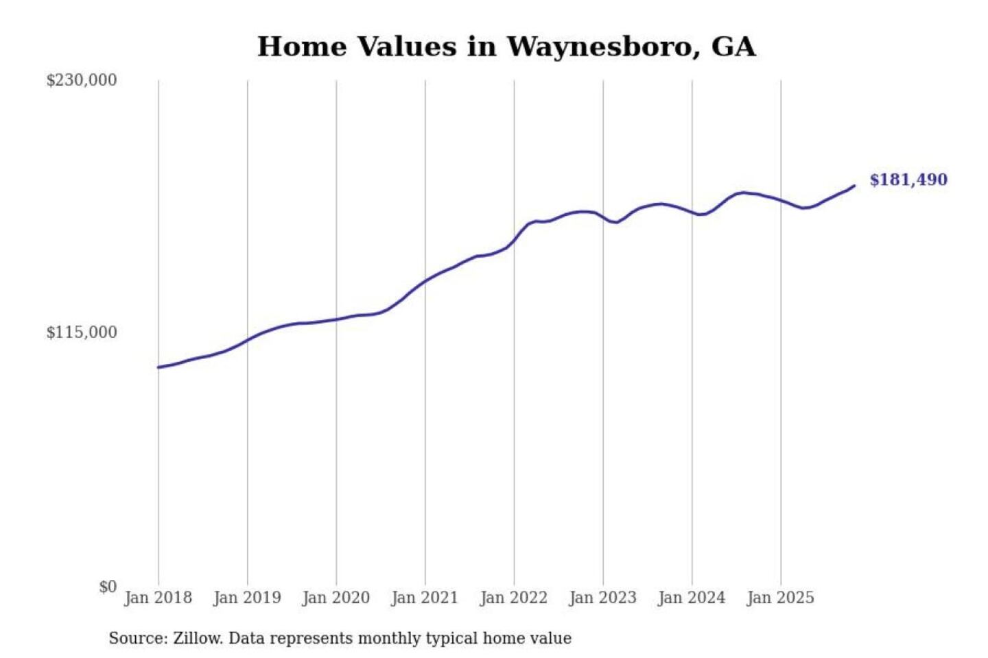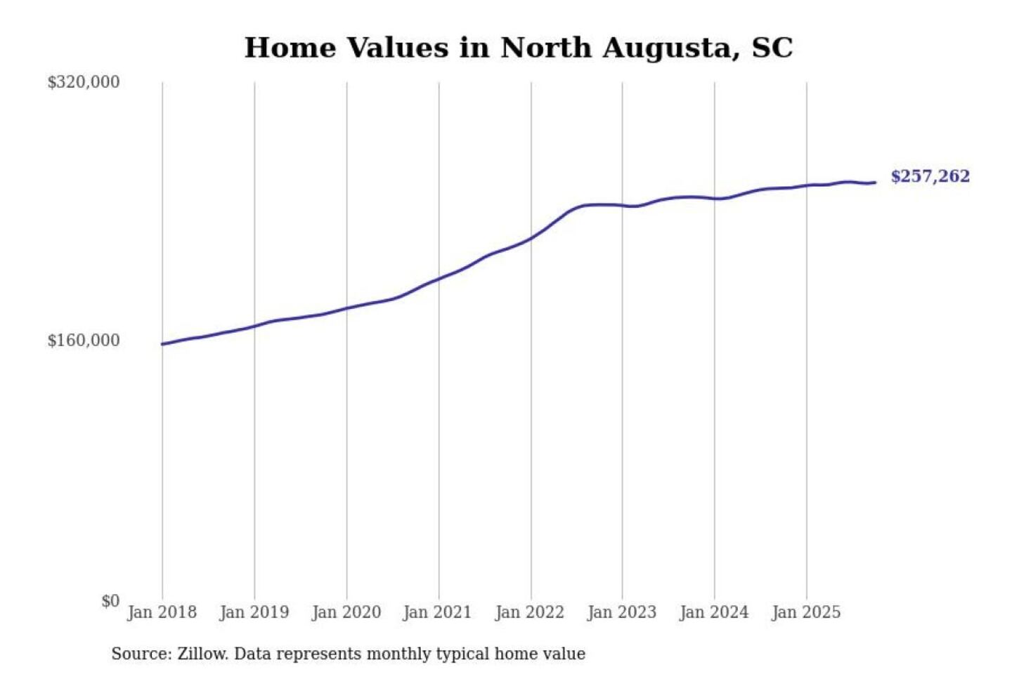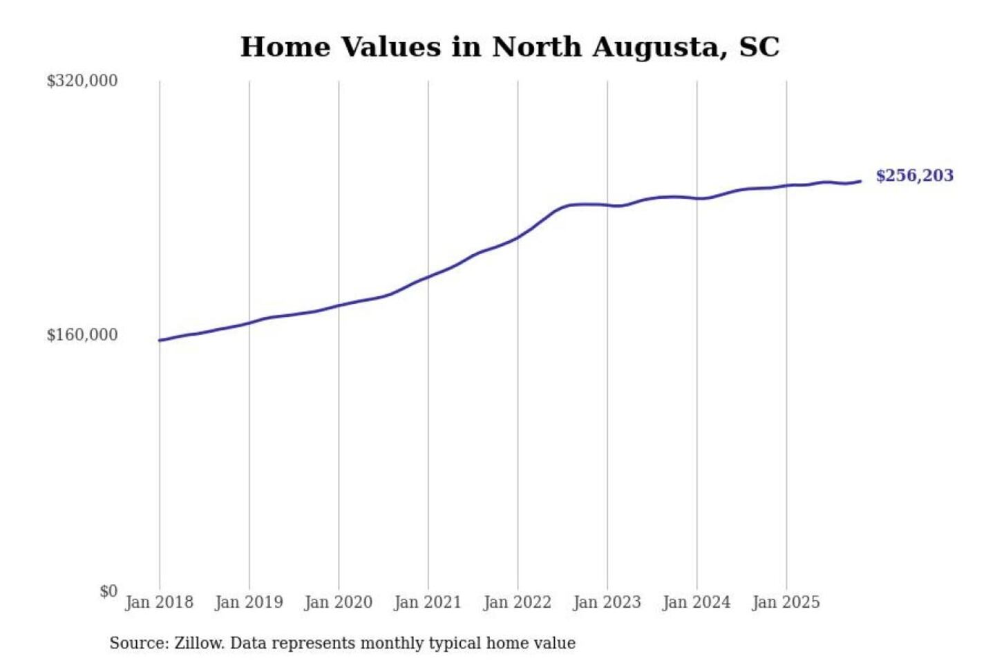 Stacker compiled a list of cities with the most expensive homes in the Augusta-Richmond County, GA-SC metro area using data from Zillow. Charts show the monthly typical home value since January 2018.