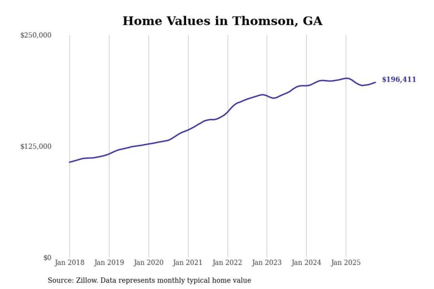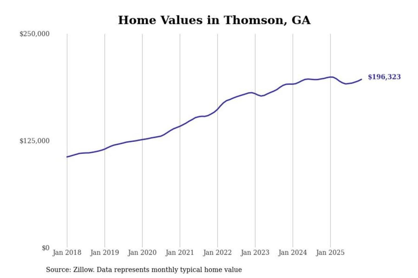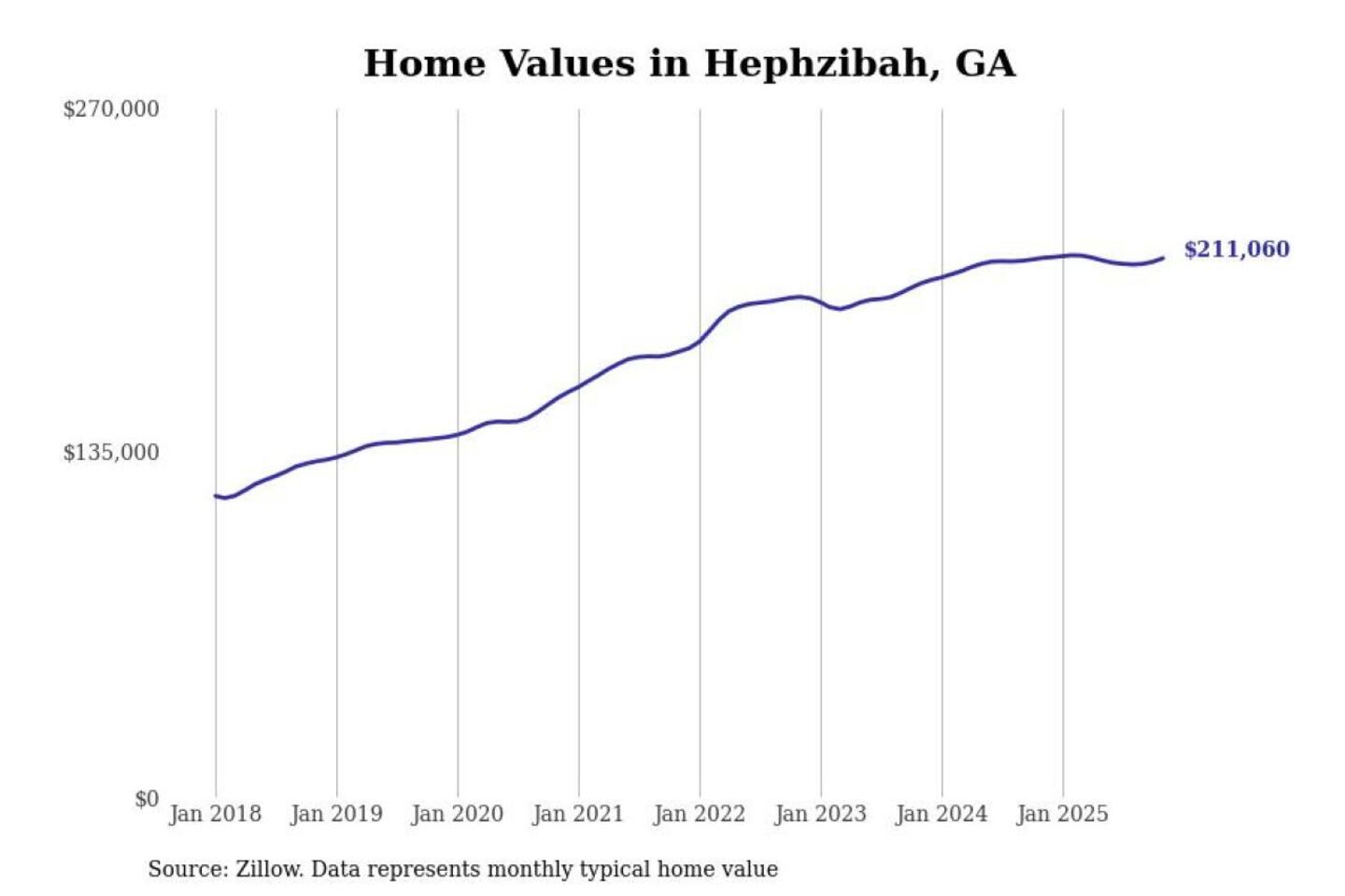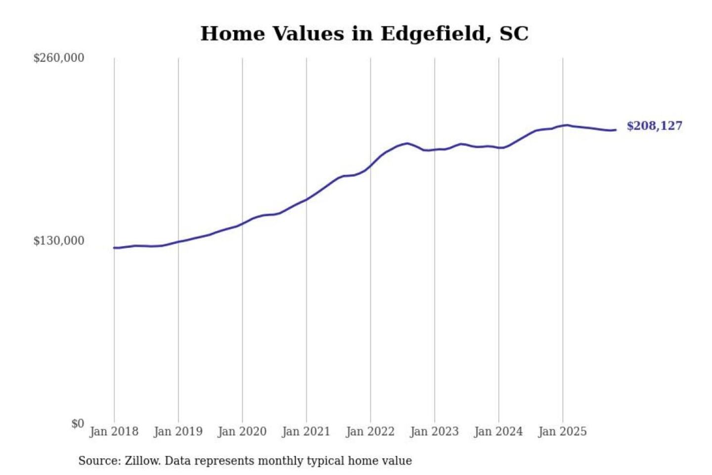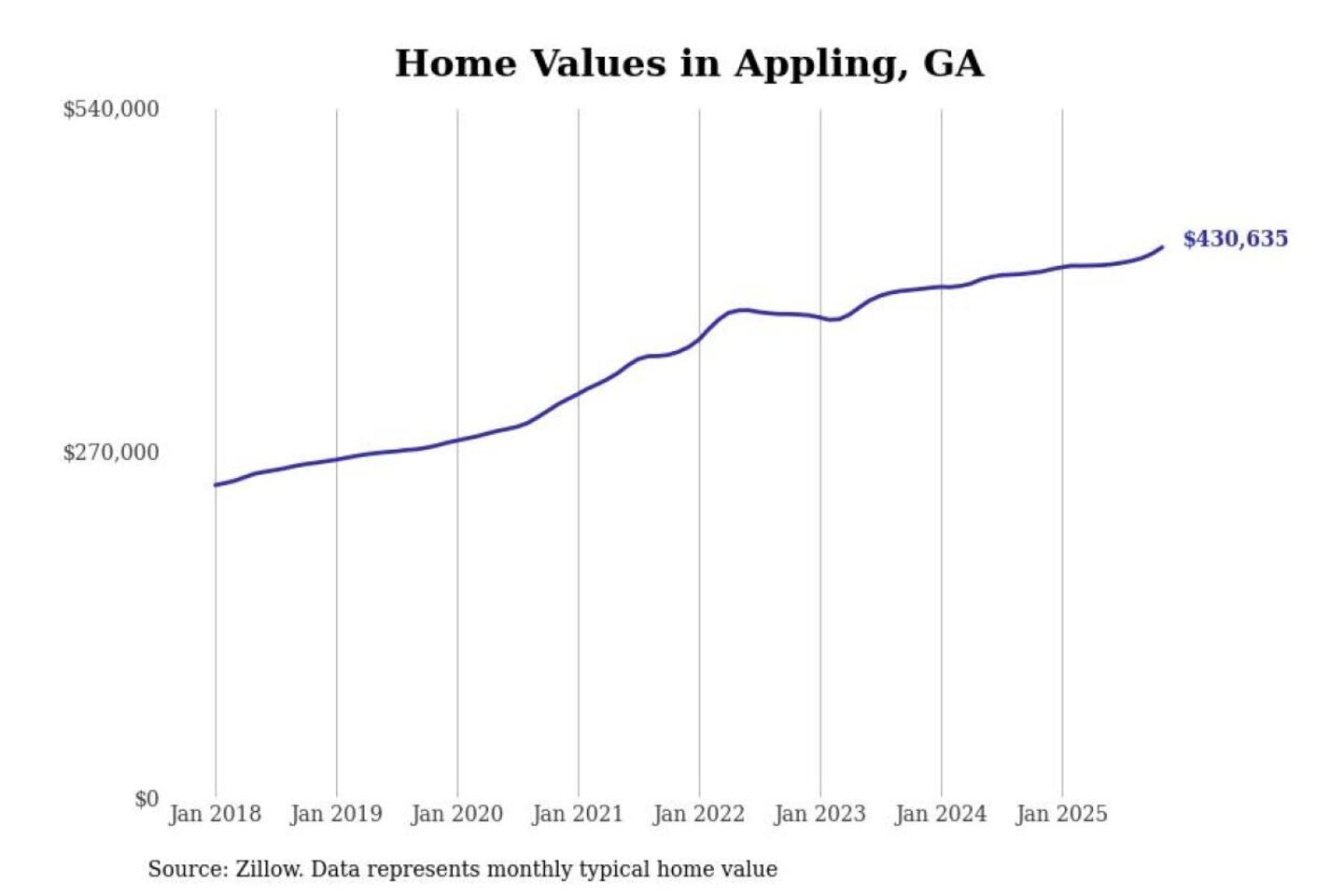 Stacker compiled a list of cities with the most expensive homes in the Augusta-Richmond County, GA-SC metro area using data from Zillow. Charts show the monthly typical home value since January 2018.