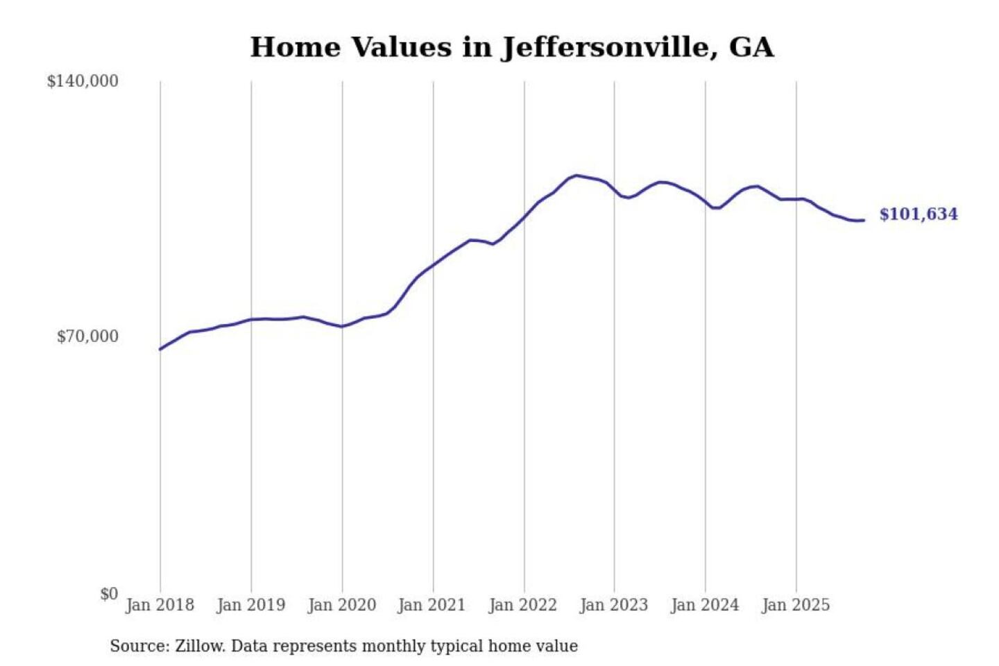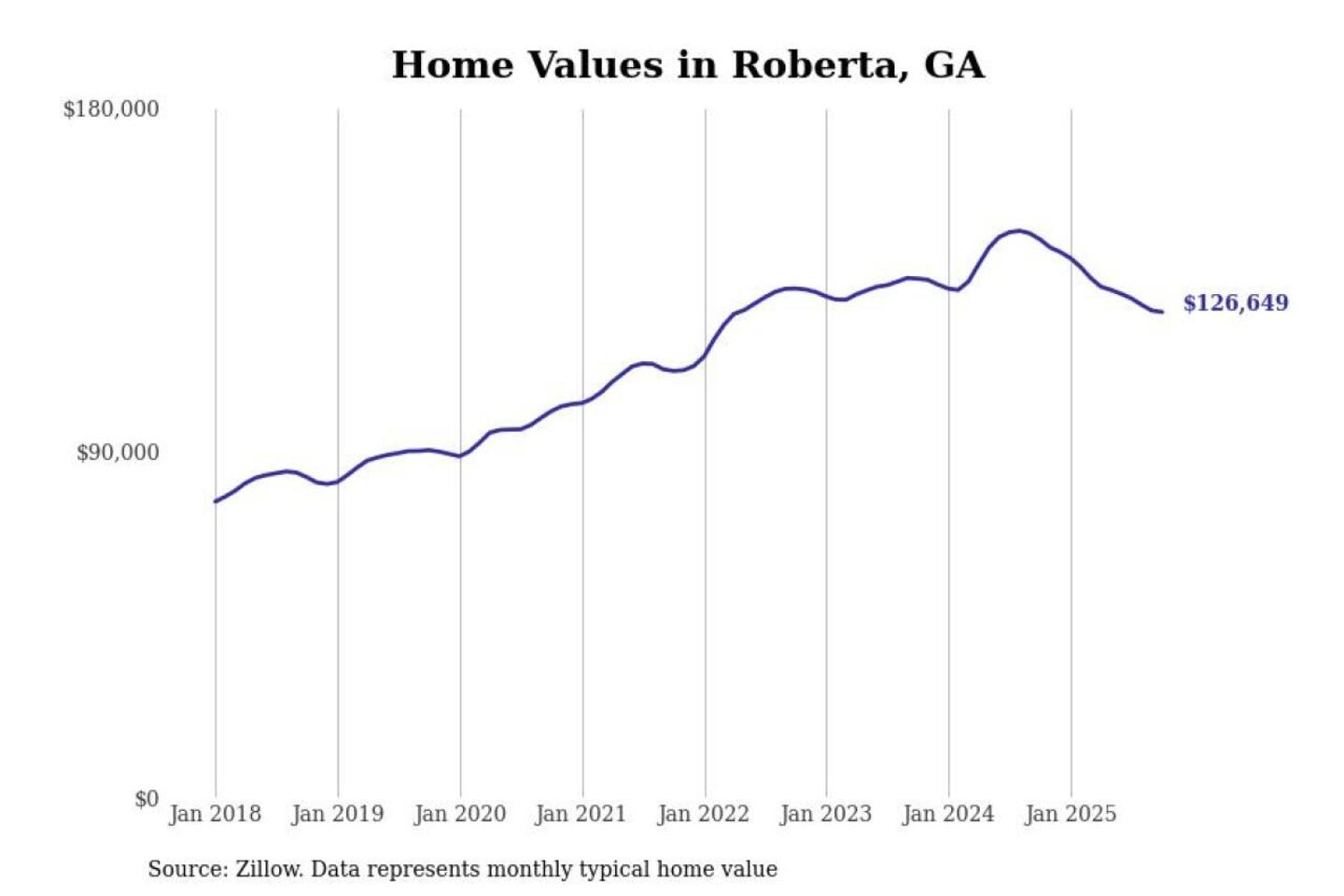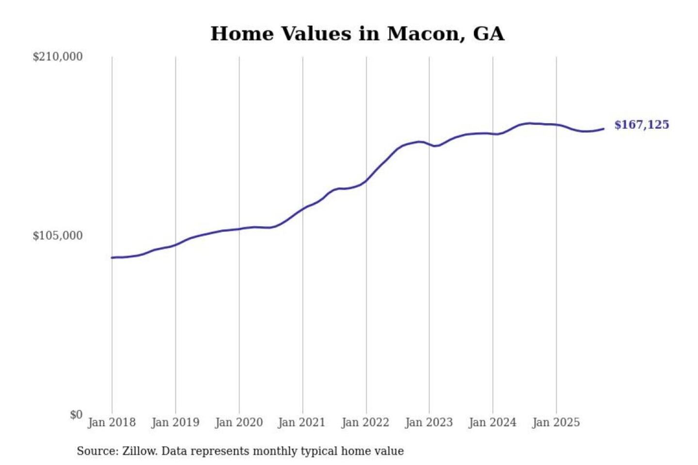 Stacker compiled a list of cities with the most expensive homes in the Macon-Bibb County, GA metro area using data from Zillow. Charts show the monthly typical home value since January 2018.