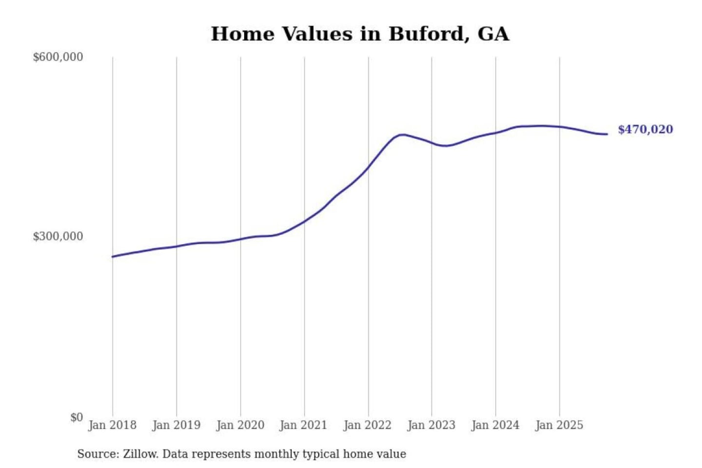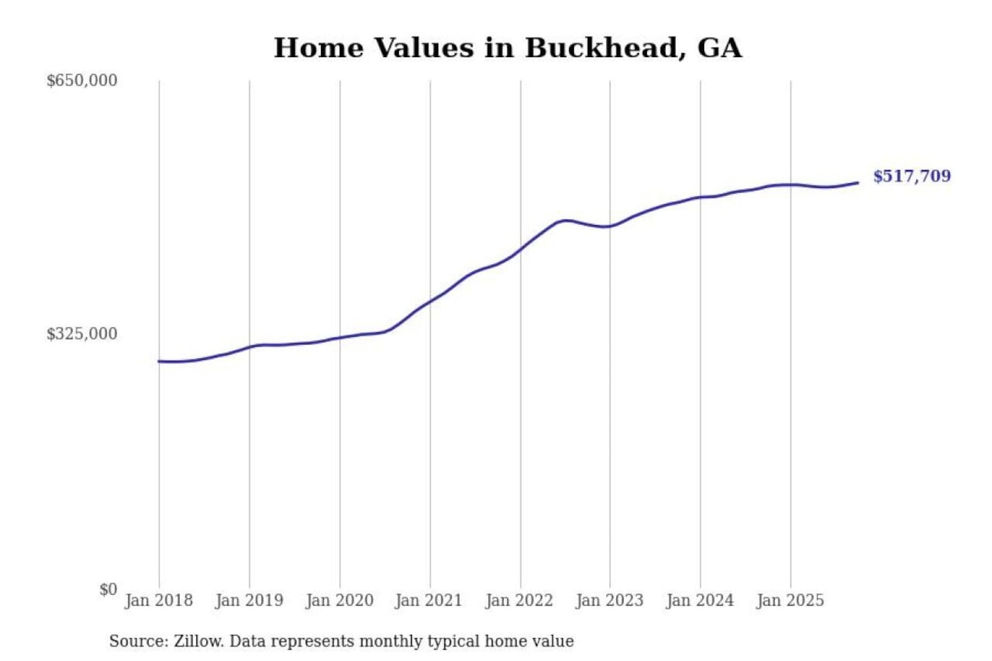 Stacker compiled a list of cities with the most expensive homes in the Atlanta metro area using data from Zillow. Charts show the monthly typical home value since January 2018. Data was available for 149 cities and towns.