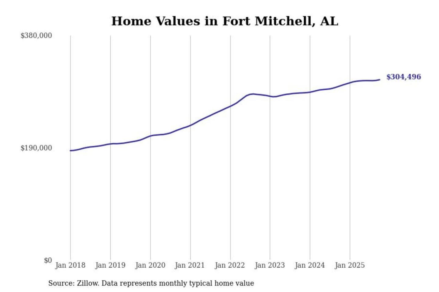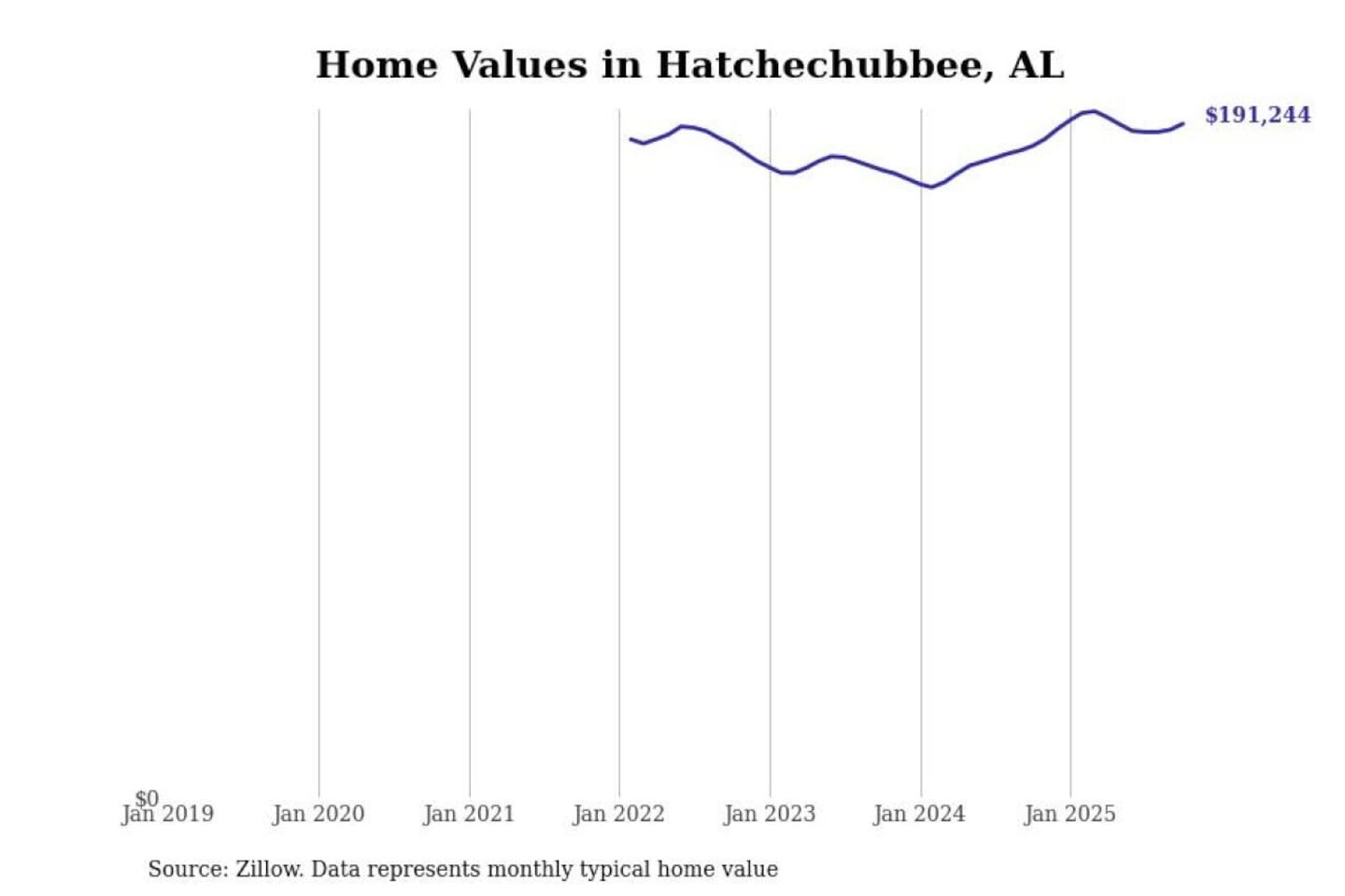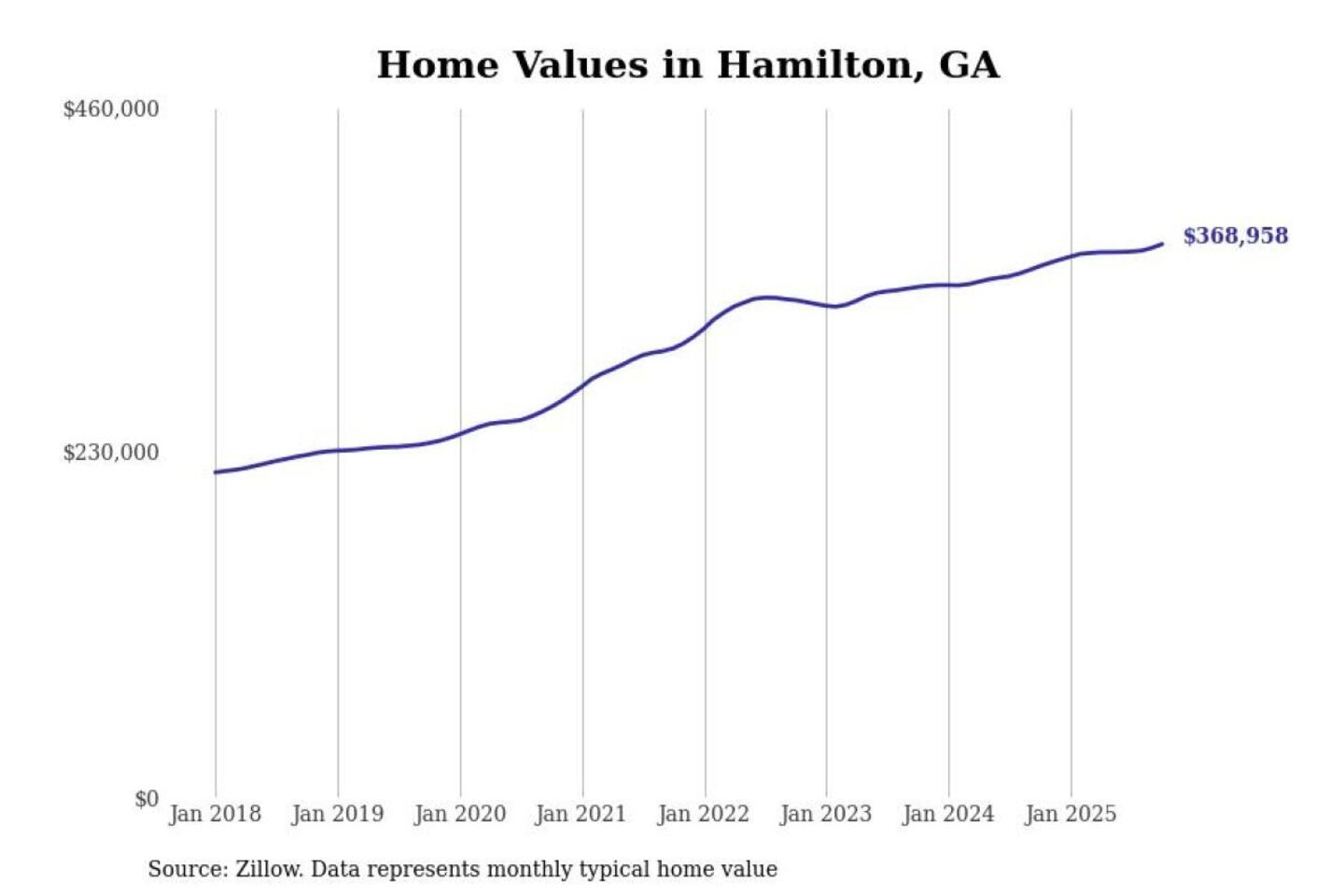 Stacker compiled a list of cities with the most expensive homes in the Columbus, Georgia metro area using data from Zillow. Charts show the monthly typical home value since January 2018. All 23 cities and towns with data available were included in the list.