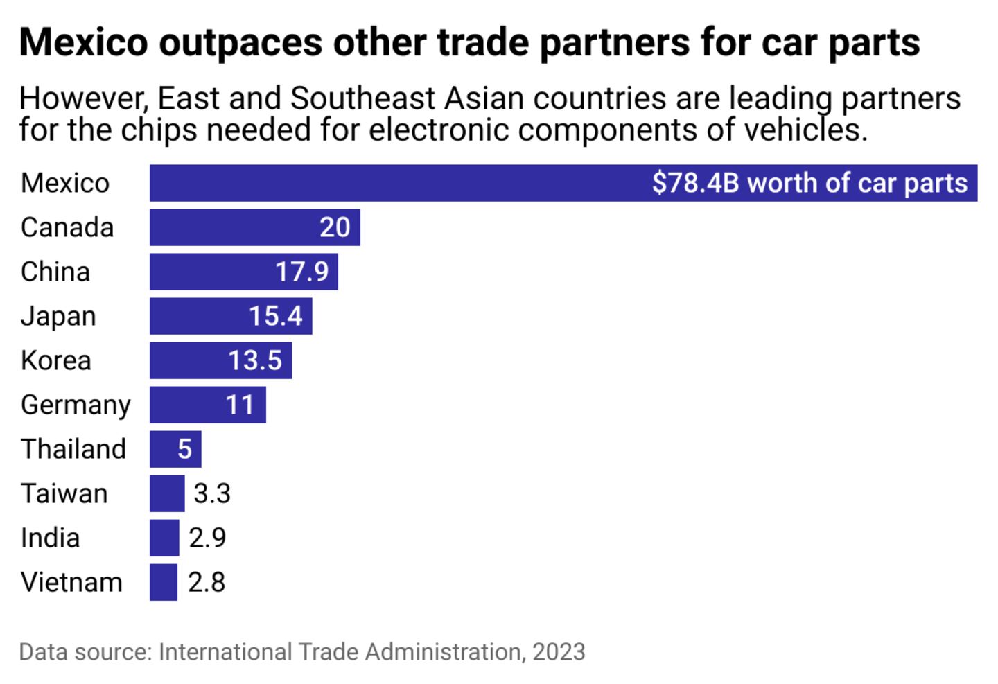 From 2019 to 2023, industrial park space in Mexico more than doubled, from 21.5 to 46 million square feet—and most of the $13 billion in industrial funding the country has secured over the last couple of years is to back auto or auto parts manufacturers, which have nearly a century of history in Mexico. The nation now far outpaces other U.S. trade partners for parts, in part due to increased supply and a more convenient, tighter supply chain.