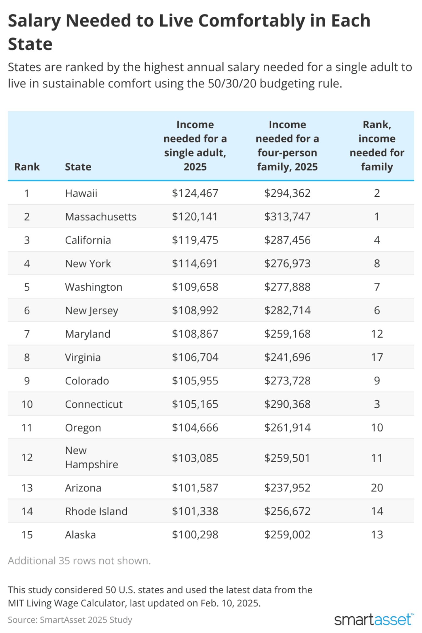 • Adults in West Virginia need just $80,829 to live comfortably. Singletons in West Virginia need least of any state, maintaining its ranking from last year when a single adult needed $78,790. However, families need the lowest income in Mississippi, where the 2025 household income needed is just $186,618 across two earners.