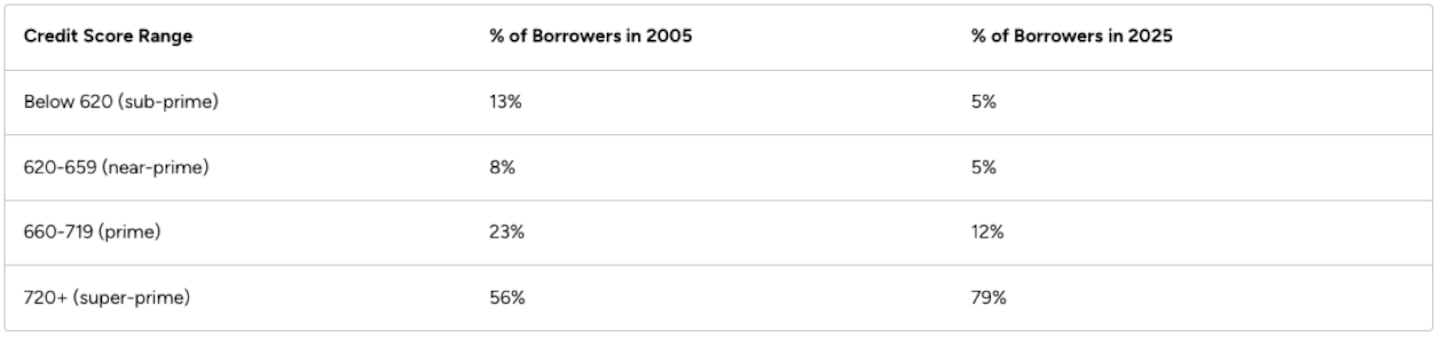 As an illustration, here are the credit scores of mortgage borrowers in 2005 and 2025: