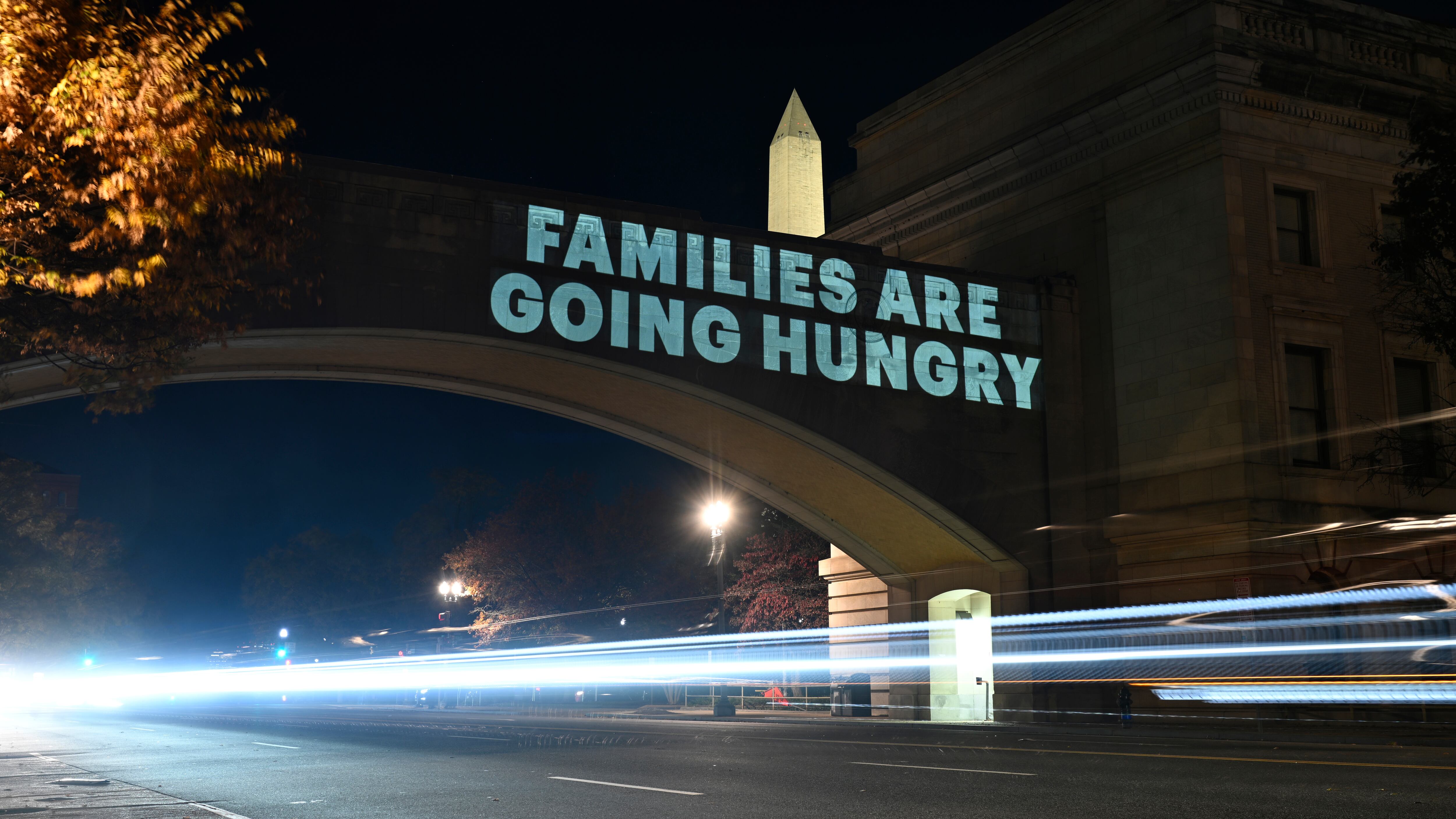 APTOPIX Government Shutdown A message from the National Women's Law Center concerning the announcement by the Trump administration of restoring only half funding the SNAP benefits is projected on the U.S. Department of Agriculture building, Monday, Nov. 3, 2025, in Washington. (AP Photo/John McDonnell) (John McDonnell/AP)