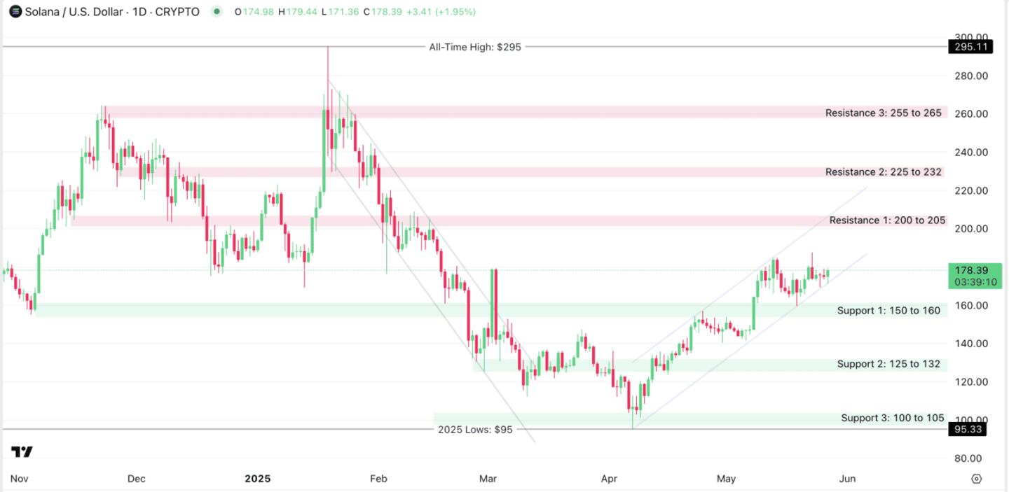 Solana experienced two consecutive bullish moves taking the coin to highs between $280 to $295 all-time highs between November 2024 and February 2025.