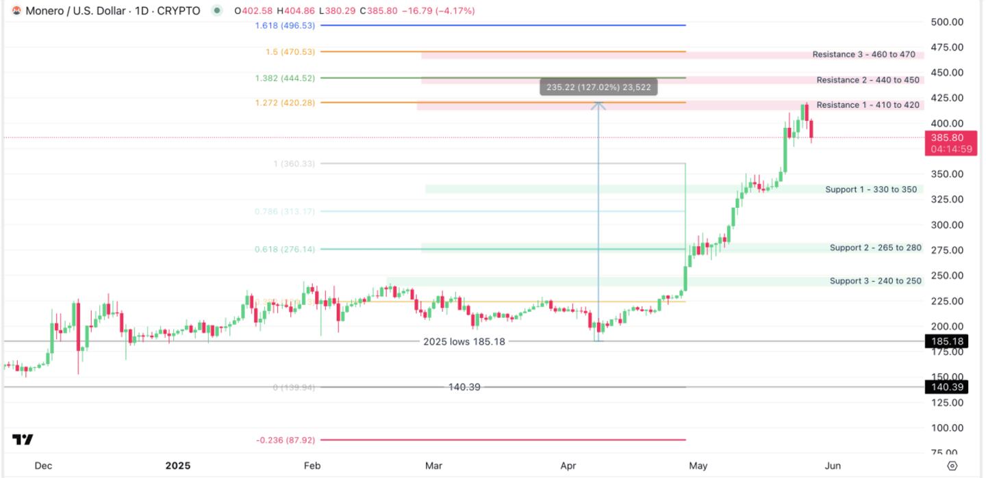 XMR began its impulsive move up in April 2025 after being in a consolidation zone between $180 and $225 since December 2024.