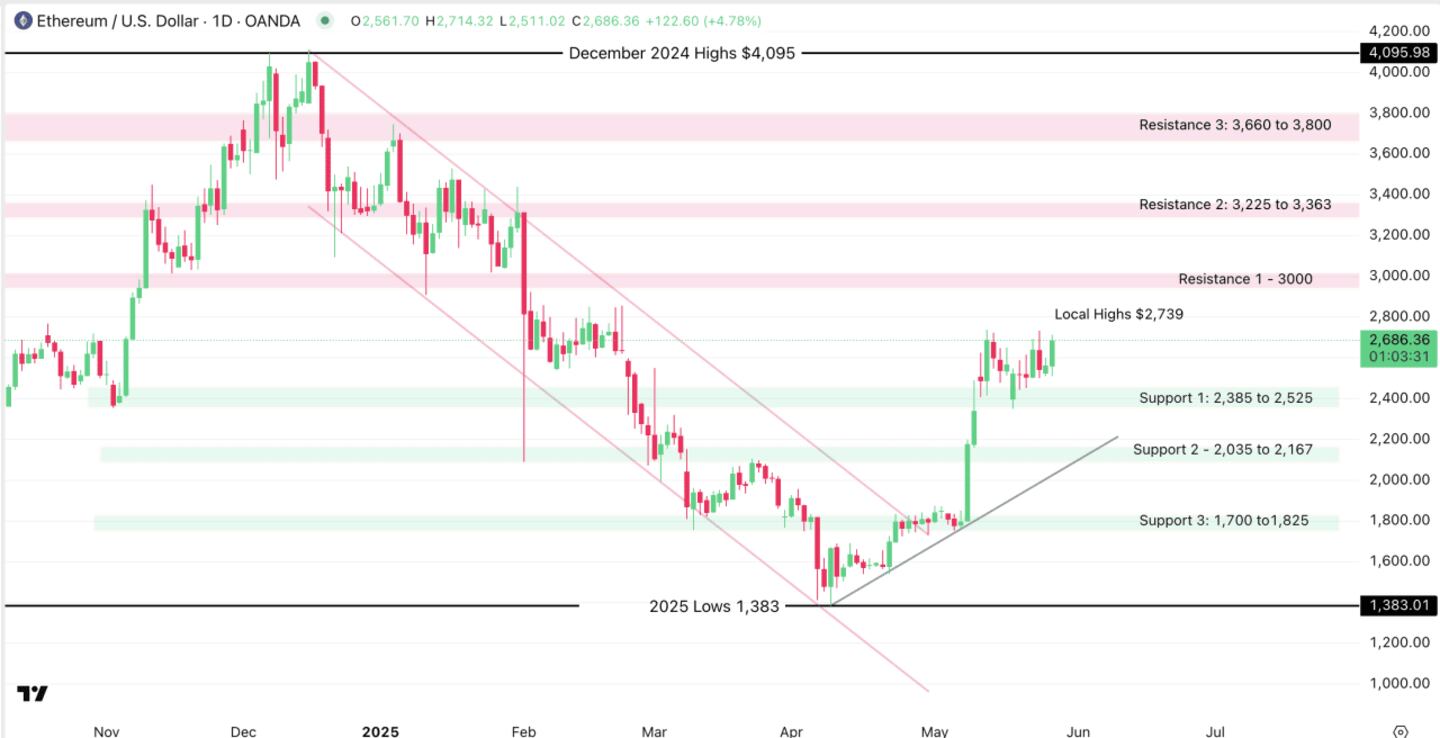 A brutal 69% correction took the coin to lows of $1,384 on April 9, with a generally positive sentiment leading to a significant recovery. Local highs are $2,739; the cryptocurrency still has quite a run to do to come back to break its all-time highs.