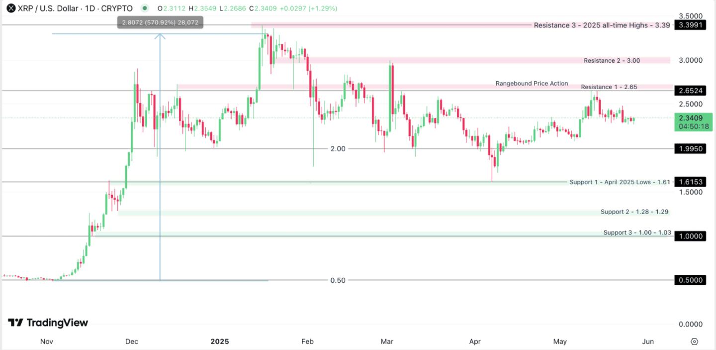 XRP has been in volatile but range-bound price action throughout 2025, coming back into its range after a trough at $1.61, which it attained at a similar time as bitcoin.