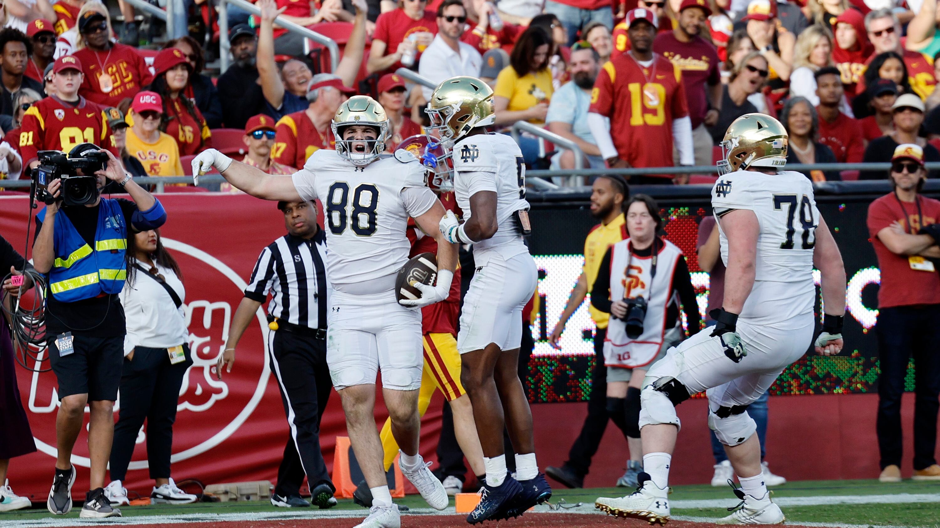 Christian Gray's 99-yard pick 6 with 3:39 remaining clinched No. 5 Notre Dame's 49–35 win over USC at the Los Angeles Memorial Coliseum on Saturday. With the victory, the Fighting Irish clinch a spot in the College Football Playoff.
