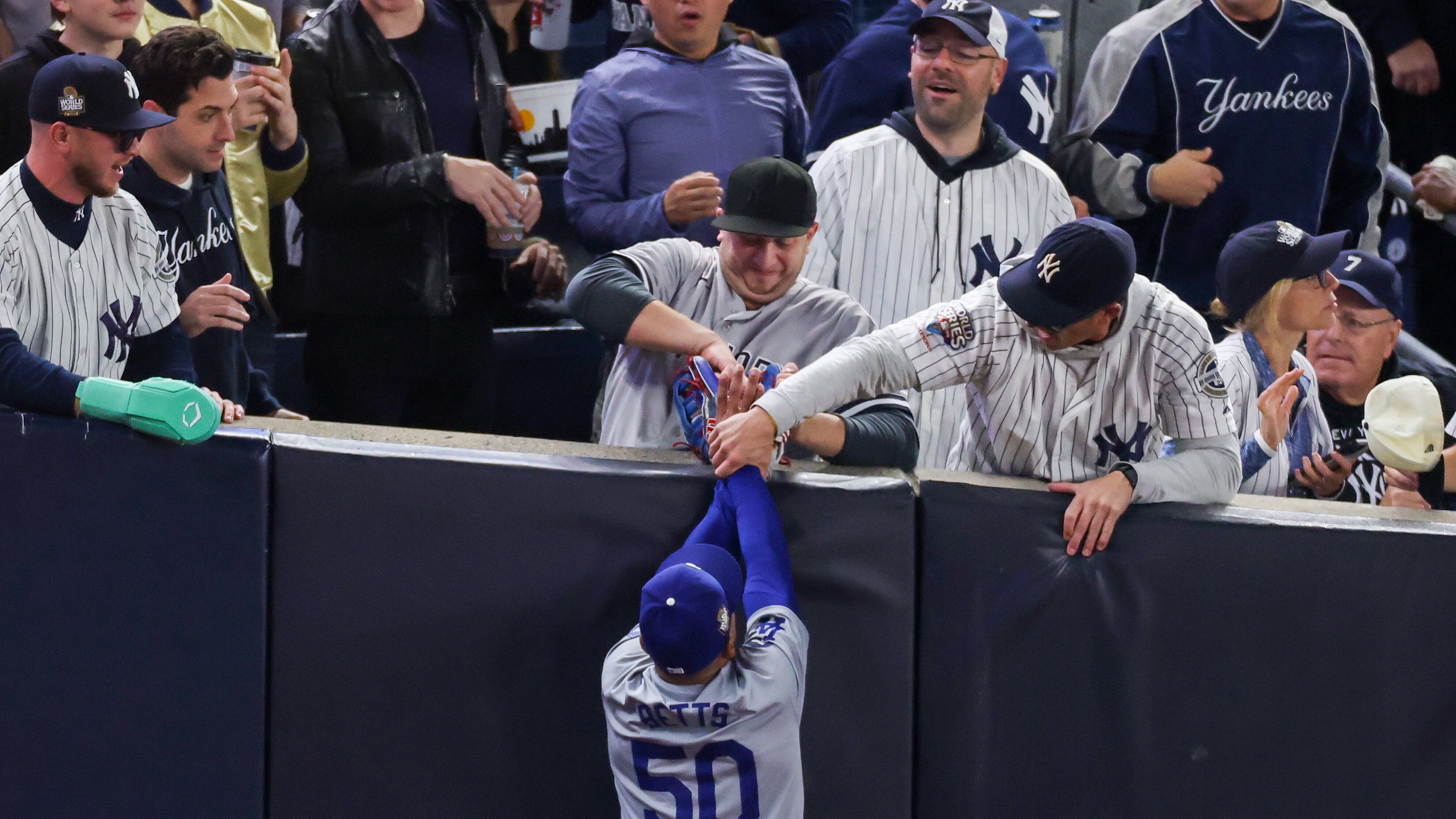 Two Yankees fans sitting in the front row near the foul pole in right field were called for fan interference after they tried to rip Betts' glove off of his hand as he made a play on a foul ball in Game 4 of the World Series, which the Yankees won, 11-4.