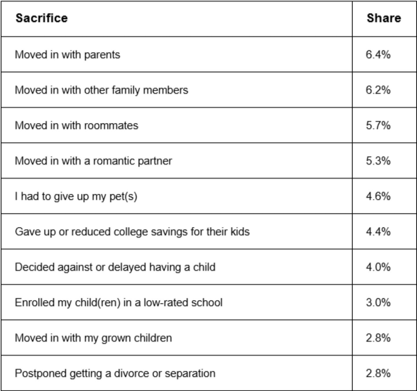 Some households reported making more significant family-related sacrifices for the sake of affordability. While less common, these changes ranged from moving in with parents, to giving up pets, to even postponing divorce.