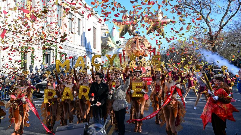 Photos: Macy's Thanksgiving Day Parade 2022 Revelers take part in the 96th-annual Macys Thanksgiving Day Parade on November 24, 2022, in New York City. The annual Macy’s parade includes 16 giant character balloons, 28 floats, and 12 marching bands. Organizers expected more than 2.5 million spectators to come out for it. (Alexi J. Rosenfeld/Getty Images)
