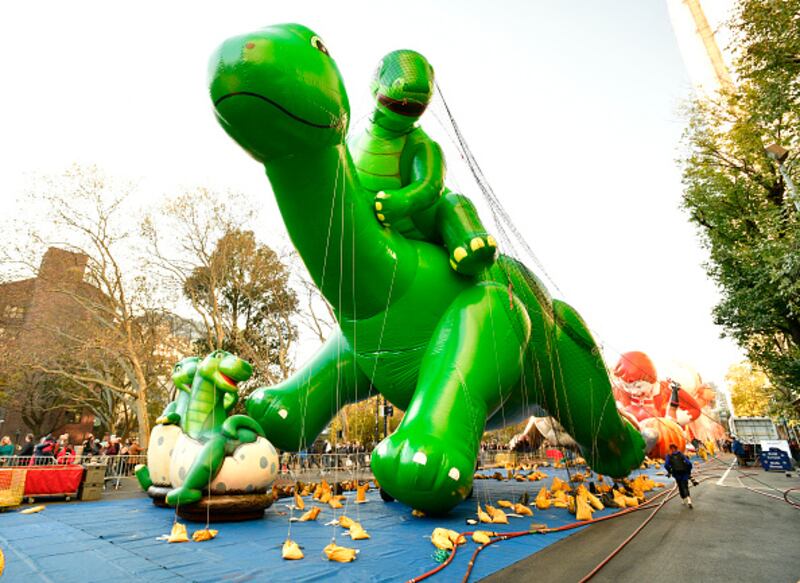 Photos: Macy's Thanksgiving Day Parade 2022 Sinclair's Dino balloons by Sinclair Oil Corporation are seen during 96th Macy's Thanksgiving Day Parade - Balloon Inflation on November 23, 2022, in New York City. (Eugene Gologursky/Getty Images for Macy's, Inc.)