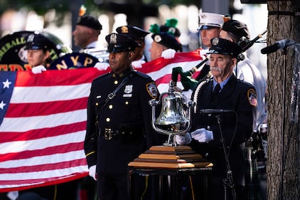 9/11 24th anniversary – Ground Zero NEW YORK, NEW YORK - SEPTEMBER 11: The first bell is rung during the annual 9/11 Commemoration Ceremony at the National 9/11 Memorial and Museum on September 11, 2025 in New York City. Government officials joined family, friends, and first responders as they gathered at Ground Zero honoring the lives of their loved ones on the 24th anniversary of the terror attacks of September 11, 2001, at the World Trade Center. (Photo by Adam Gray/Getty Images) (Adam Gray/Getty Images)