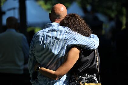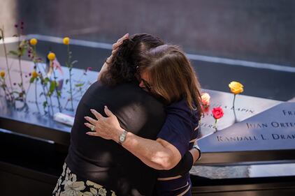 9/11 24th anniversary – Ground Zero NEW YORK, NEW YORK - SEPTEMBER 11: Two people embrace at the south reflecting pool memorial during the annual 9/11 Commemoration Ceremony at the National 9/11 Memorial and Museum on September 11, 2025 in New York City. Government officials joined family, friends, and first responders as they gathered at Ground Zero honoring the lives of their loved ones on the 24th anniversary of the terror attacks of September 11, 2001, at the World Trade Center. (Photo by Adam Gray/Getty Images) (Adam Gray/Getty Images)