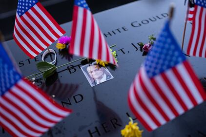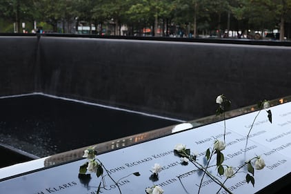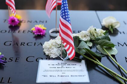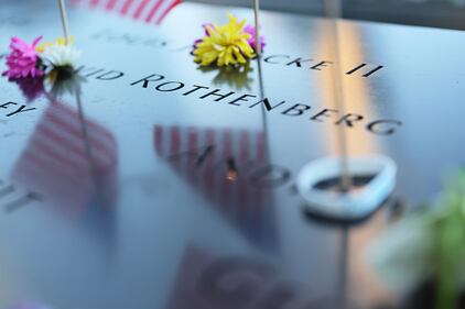 9/11 - Ground Zero NEW YORK, NEW YORK - SEPTEMBER 11: Flowers, a photograph and flag are seen on the names of victims of the 9/11 terror attack on the South Tower reflecting pool during the annual 9/11 Commemoration Ceremony at the National 9/11 Memorial and Museum on September 11, 2025 in New York City. Local and national government officials joined family, friends, and first responders as they gathered at Ground Zero honoring the lives of their loved ones on the 24th anniversary of the terror attacks of September 11, 2001, at the World Trade Center. (Photo by Michael M. Santiago/Getty Images) (Michael M. Santiago/Getty Images)