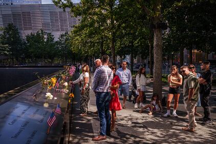 9/11 24th anniversary – Ground Zero NEW YORK, NEW YORK - SEPTEMBER 11: People gather in lower Manhattan on the 24th anniversary of the 9/11 terror attacks on September 11, 2025, in New York City. The nation is marking the twenty-fourth anniversary of the attacks on September 11, 2001, that killed 2,977 people at the World Trade Center site, the Pentagon, and those aboard Flight 93 in Shanksville, PA. (Photo by Spencer Platt/Getty Images) (Spencer Platt/Getty Images)