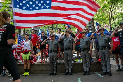 9/11 24th anniversary – Ground Zero NEW YORK, NEW YORK - SEPTEMBER 11: New York State Troopers and other law enforcement salute during a memorial service in lower Manhattan on the 24th anniversary of the 9/11 terror attacks on September 11, 2025, in New York City. The nation is marking the twenty-fourth anniversary of the attacks on September 11, 2001, that killed 2,977 people at the World Trade Center site, the Pentagon, and those aboard Flight 93 in Shanksville, PA. (Photo by Spencer Platt/Getty Images) (Spencer Platt/Getty Images)