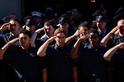 9/11 24th anniversary – Ground Zero NEW YORK, NEW YORK - SEPTEMBER 11: New York City firefighters walk near the National September 11 Memorial & Museum in lower Manhattan on the 24th anniversary of the 9/11 terror attacks on September 11, 2025, in New York City. The nation is marking the twenty-fourth anniversary of the attacks on September 11, 2001, that killed 2,977 people at the World Trade Center site, the Pentagon, and those aboard Flight 93 in Shanksville, PA. (Photo by Spencer Platt/Getty Images) (Spencer Platt/Getty Images)