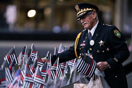 9/11 - Ground Zero NEW YORK, NEW YORK - SEPTEMBER 11: Former police officer Sam Pulia places flags on the south reflecting pool before the annual 9/11 Commemoration Ceremony at the National 9/11 Memorial and Museum on September 11, 2025 in New York City. Government officials joined family, friends, and first responders as they gathered at Ground Zero honoring the lives of their loved ones on the 24th anniversary of the terror attacks of September 11, 2001, at the World Trade Center. (Photo by Adam Gray/Getty Images) (Adam Gray/Getty Images)