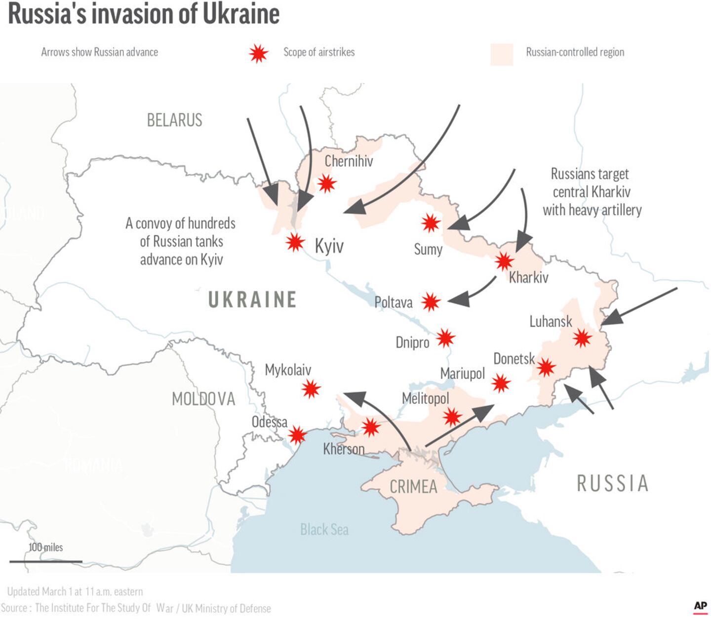 Russia seized its first major Ukrainian city -- the southern port of Kherson -- during fighting on Wednesday. A large convoy of Russian soldiers and military vehicles continued to threaten the capital city of Kyiv from the north.